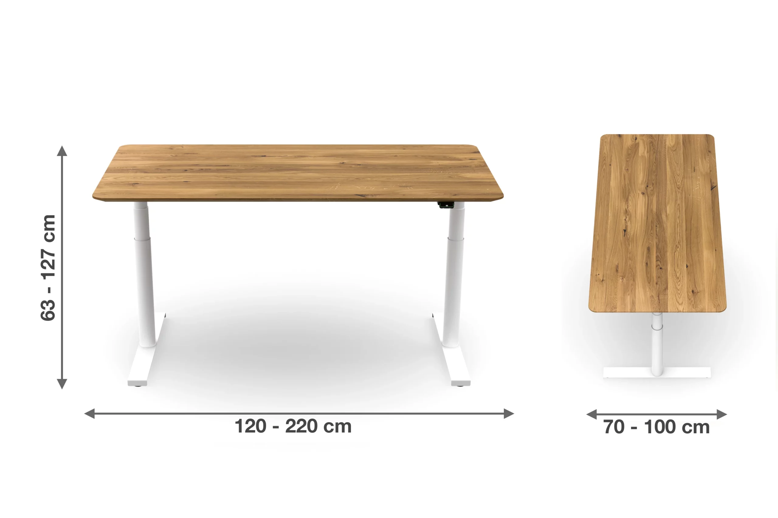 Das Tischgestell ist aus stabilem Stahl gefertigt und kann ein Gewicht von 120kg (inklusive Tischplatte) ohne Problem heben. Die Höhe lässt sich von 63 bis 127cm einstellen. Damit können sowohl Schulkinder an dem Tisch sitzen als auch große Menschen am Tisch stehen.