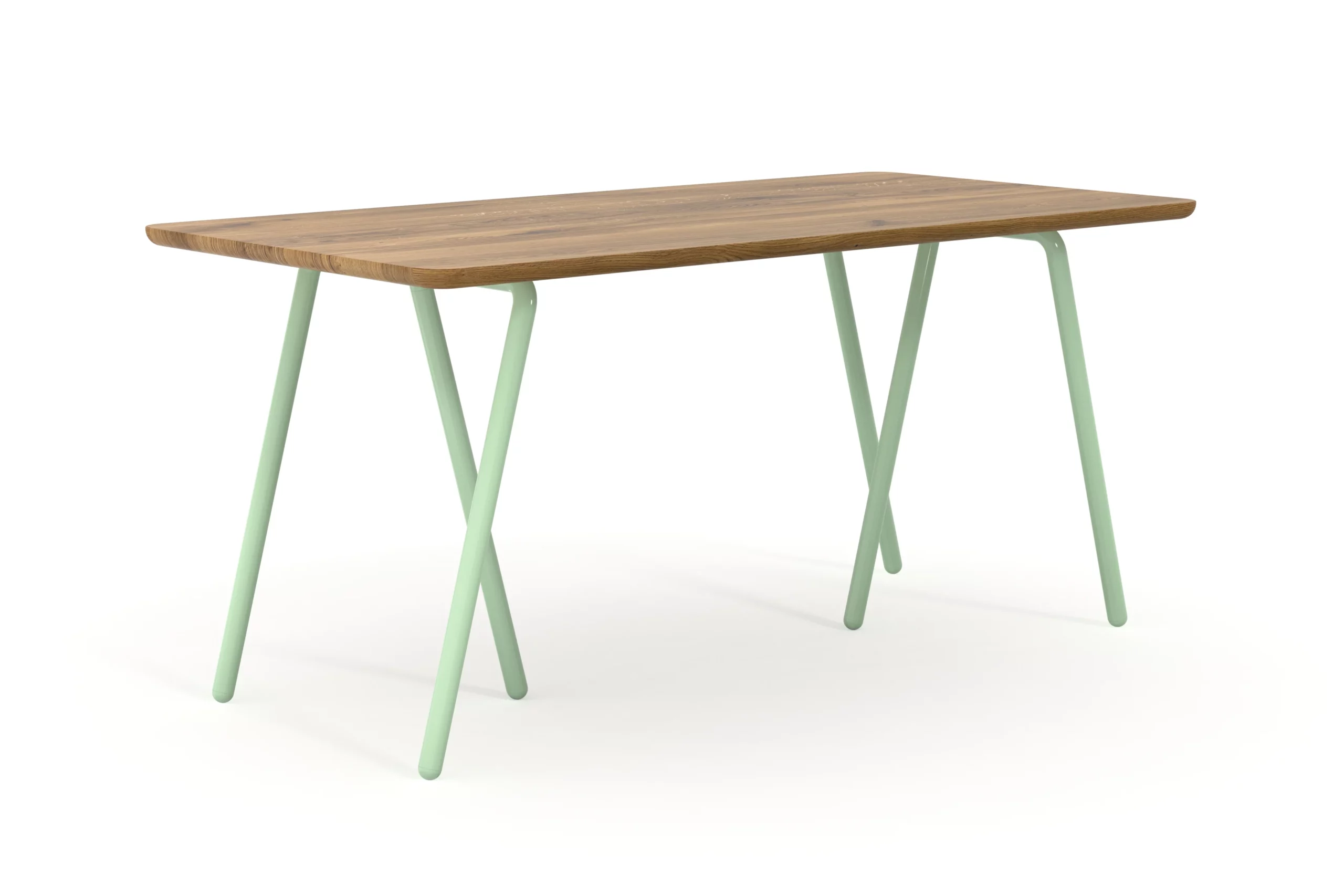 In der einfachsten Tischbock-Form hat Libra trotzdem eine stabilen Stand. Das gebogene Stahlrohr macht ihn praktisch unverwüstlich. Die Rundungen wirken weich und elegant. Für den Transport lässt sich das Mittelbein schnell und einfach herausdrehen.