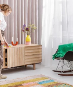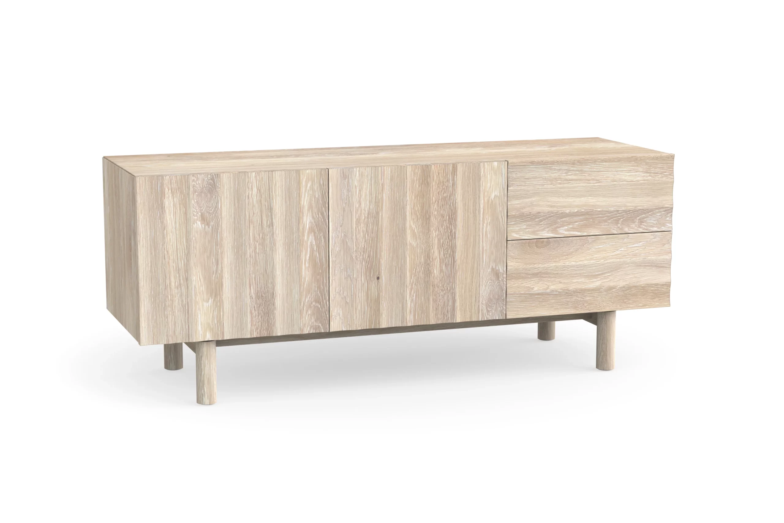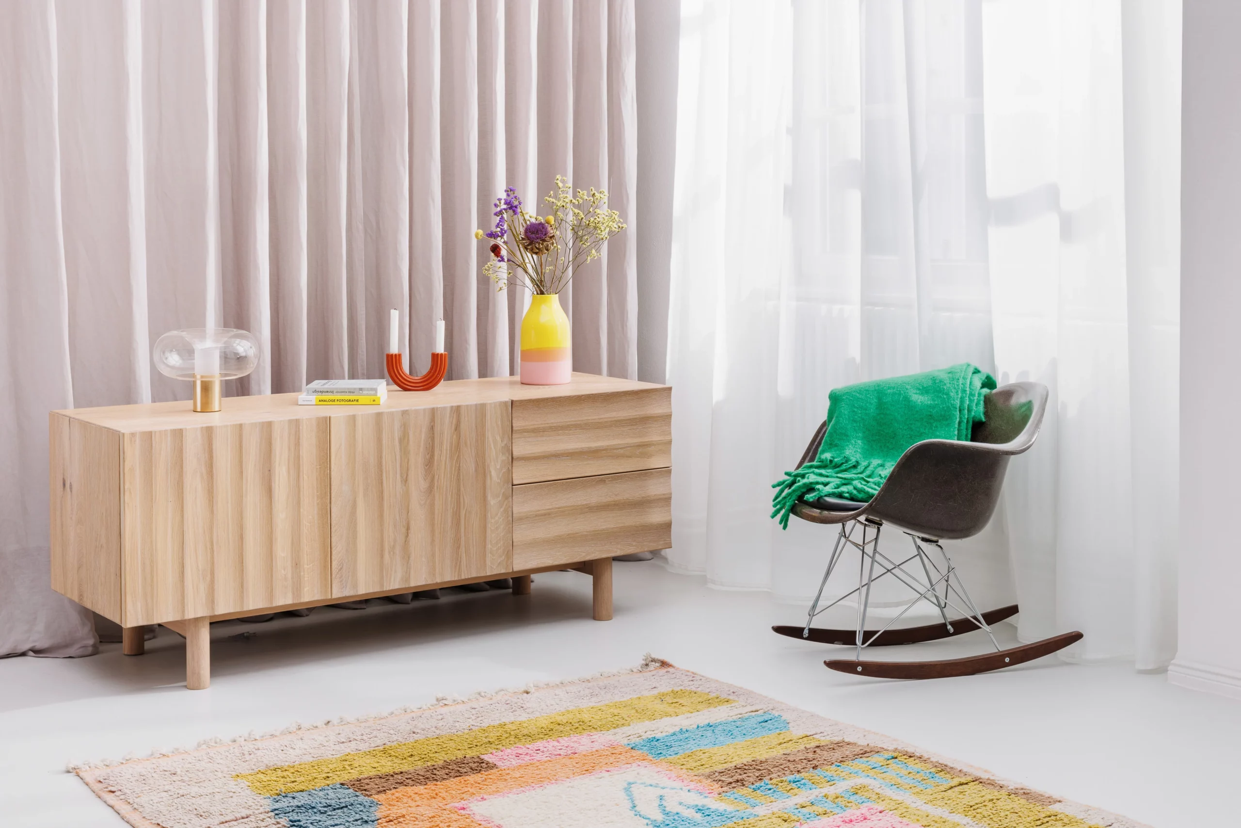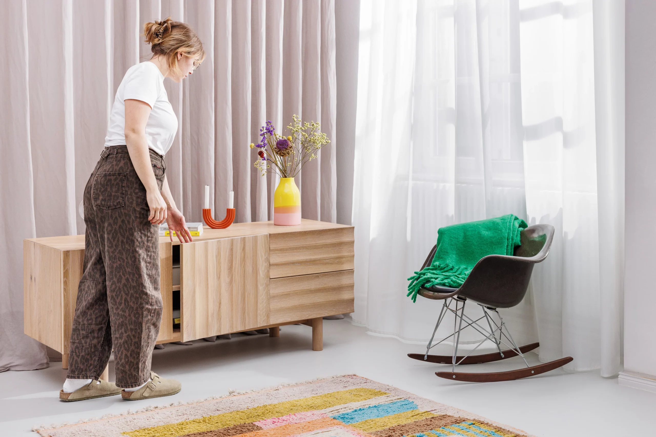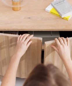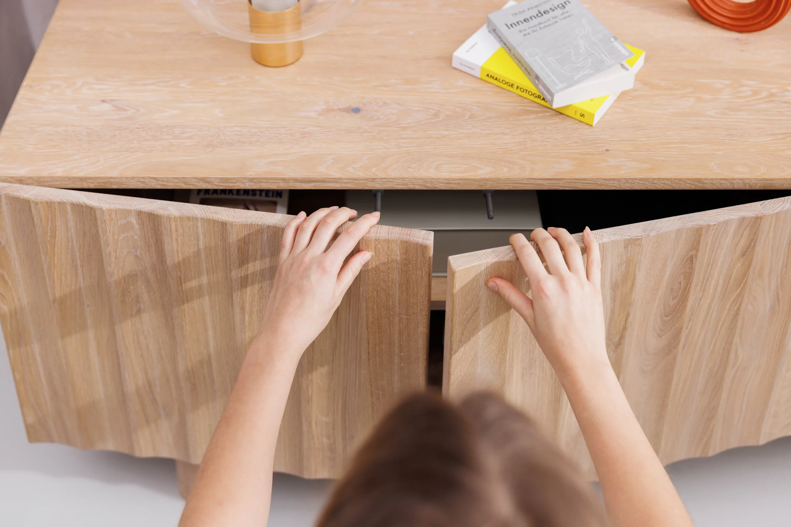 Dùn kommt mit zwei großen Schubladen mit Push-to-open Funktion. Du kannst es entweder als offenes Regal, mit per Hand verarbeiteten Türen aus Massivholz bestellen. Die Massivholz-Türen sind wie perfekt ineinander laufende Wellen gestaltet. Die weichen Rundungen des Sideboards schmeicheln der Hand bei Berührung.