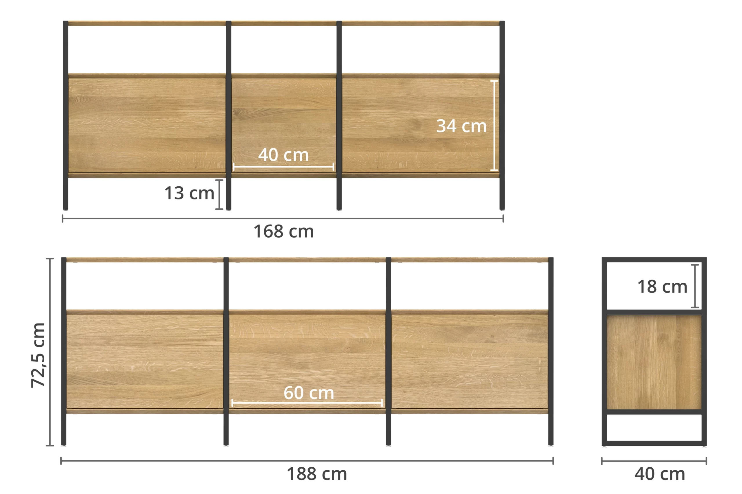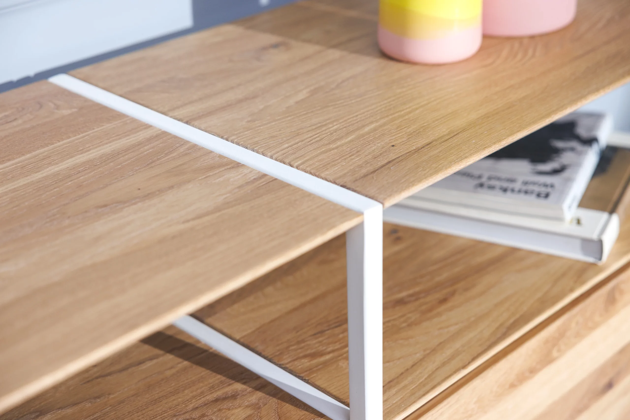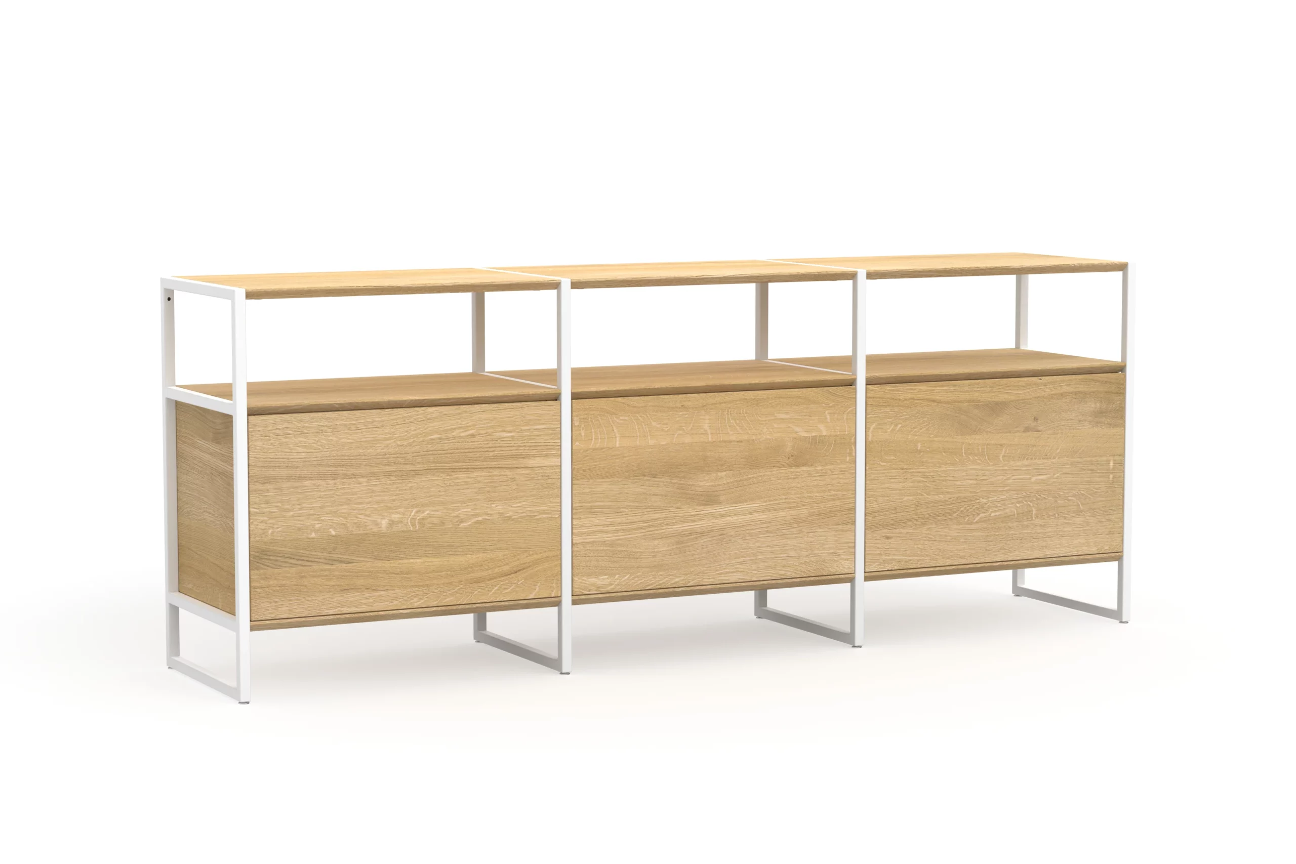 Durch den schlanken Rahmen und Regale in zwei unterschiedlichen Breiten in 40 oder 60 cm mit schmal gefrästen Kanten kommt Wega sehr stilvoll daher. Dank des Rahmens aus pulverbeschichtetem Stahl benötigt das Sideboard weniger Material und ist trotzdem äußerst stabil. Dezente verstellbare Füße gleichen Unebenheiten im Boden aus.