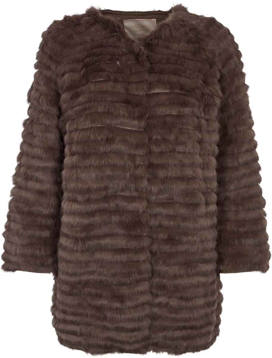 Sisi ist ein leichter und schöner, kürzerer Cardigan aus Kaninchenfell. Der Cardigan besteht aus mehreren Bändern aus Kaninchenfell, die sich wie Streifen durch die ganze Jacke ziehen. Der Cardigan wird mit Druckknöpfen in der Mitte geschlossen.