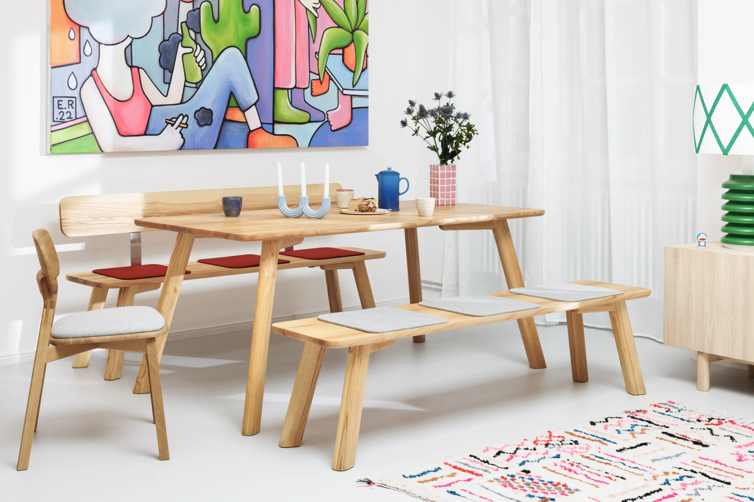 Alle Kanten werden abgerundet und die Beine sind leicht nach innen gekippt. Für die Kanten der Sitzbank kannst du aus vier unterschiedlichen Schliffen wählen – passend zu deinem Esstisch.