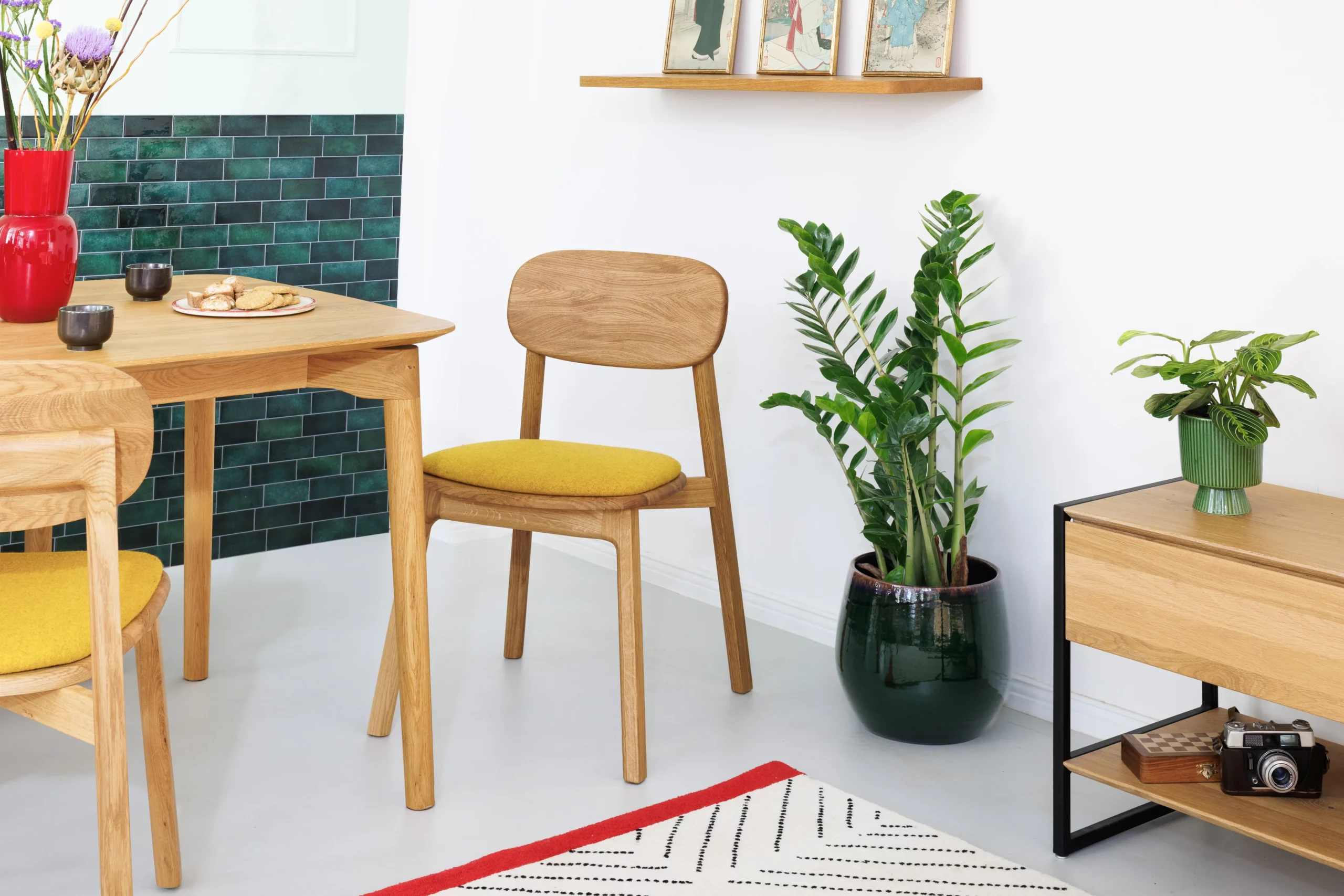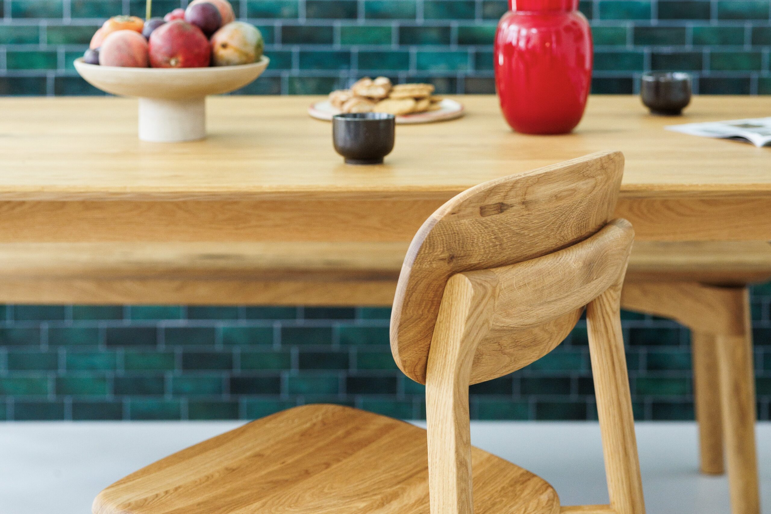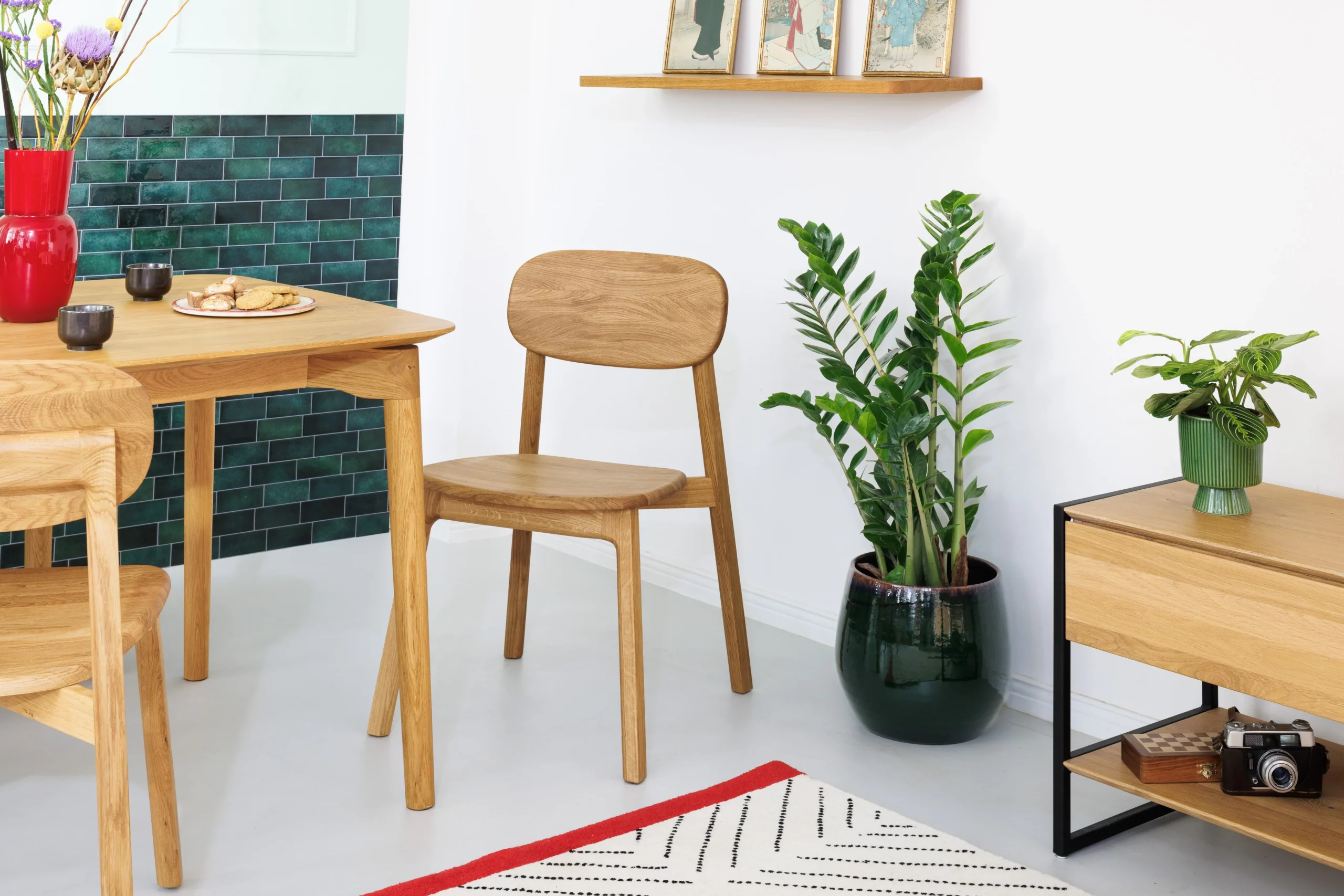 Der Esszimmerstuhl June wird aus robustem Massivholz gefertigt und wirkt trotzdem weich und filigran. Bei Sitzfläche und Lehne werden Kurven in das Holz gefräst – so schmiegt sich June an die natürliche Form deines Körpers.