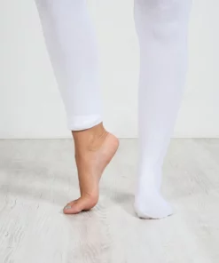 Endlich Tanzstrumpfhosen in Übergröße. Diese 120 Denier weißen Strumpfhosen können dank eines strategisch gestalteten Fußlochs von fußlos zu geschlossen umgewandelt werden. Sie sind durchgehend gestrickt, ohne einen Chub Rub-Band, sodass sie problemlos mit einem Leotard getragen werden können. Tanzen Sie bequem los.