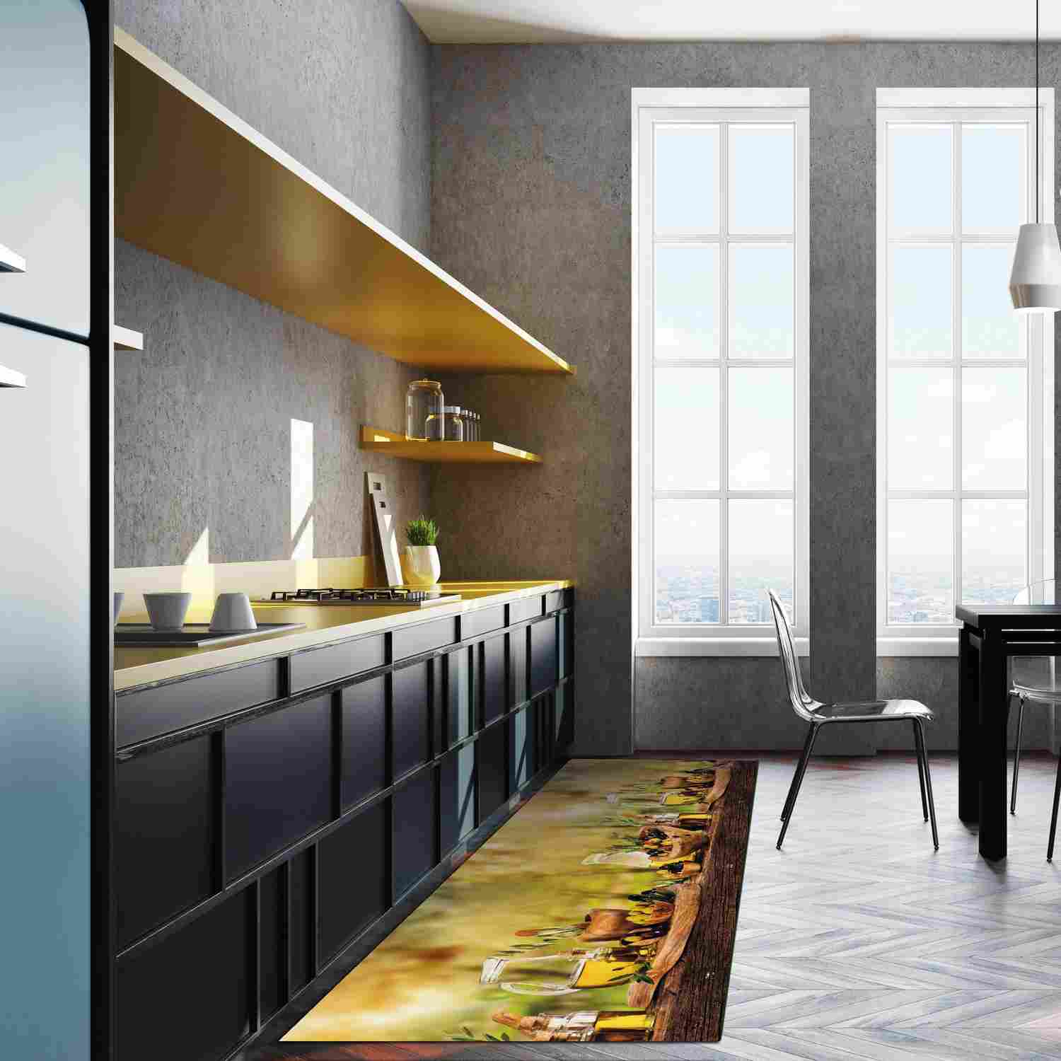In der Küche muss nicht immer alles nur funktional sein: Der WohnDirect Küchenläufer verbindet praktische Aspekte mit modernem und stilvollem Design. Der Läufer kommt mit einem rustikalen Motiv mit Oliven Muster daher und wertet garantiert jede Küche optisch auf. Der Teppich für Ihre Küche besteht aus bedrucktem PVC, so dass auch tropfendes Wasser vom Abwasch dem Blickfang nichts anhaben kann. Sie können Ihren Läufer individuell zuschneiden, so dass er sich perfekt in Ihre Kochoase einfügt. Und wenn mal kein Wasser, sondern Soße auf den Teppich tropfen sollte, lässt sich dieser ganz entspannt bei 40°C in der Waschmaschine reinigen.